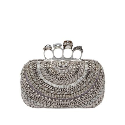 A standout feature is the silver-finished knuckle metal handle, which adds a unique and stylish touch. The bag includes one main compartment with an internal card holder for easy organization. Additionally, there is a flat pocket at the back for extra storage.