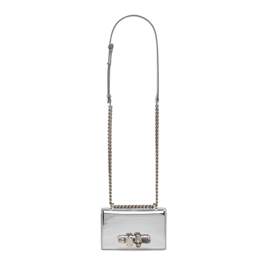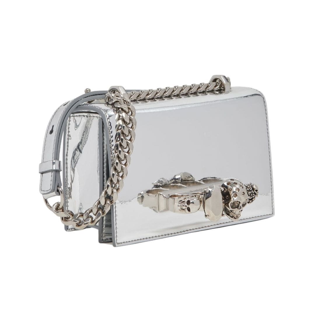 This Alexander Mcqueen Womans Mini Jewelled Satchel In Gray from Italy merges sophistication with practicality in a compact and stylish design. Measuring 17.5 x 9.5 x 4 cm (6.8 x 3.7 x 1.5 inches), it offers ample space for your essentials while maintaining a sleek and elegant profile. The bag features a stunning silver four-ring embellishment encrusted with crystals, adding a touch of glamour and luxury to its appearance.