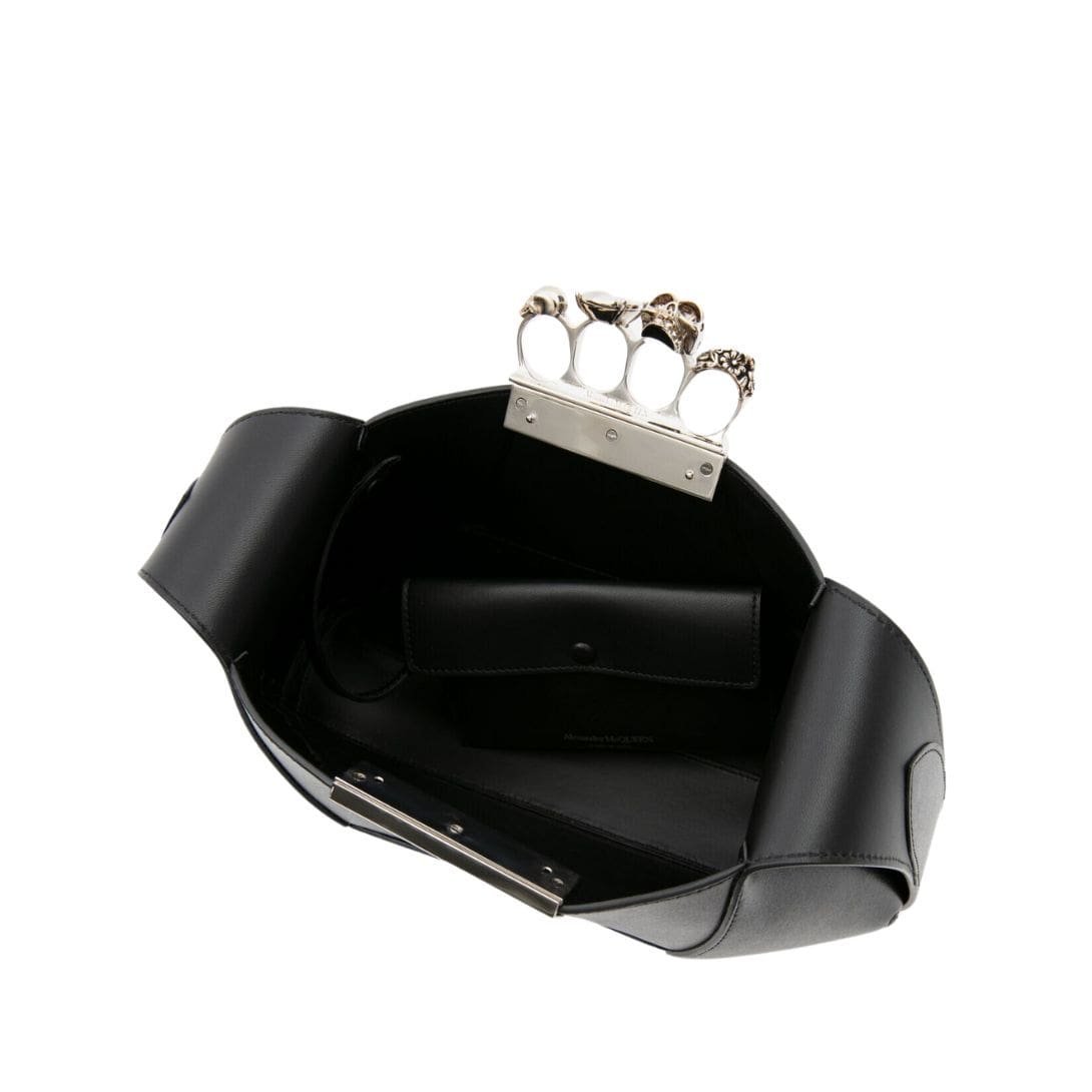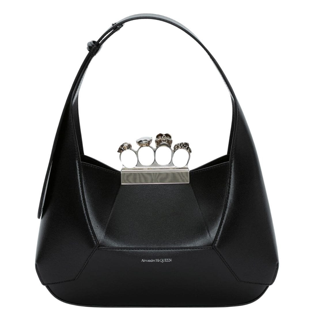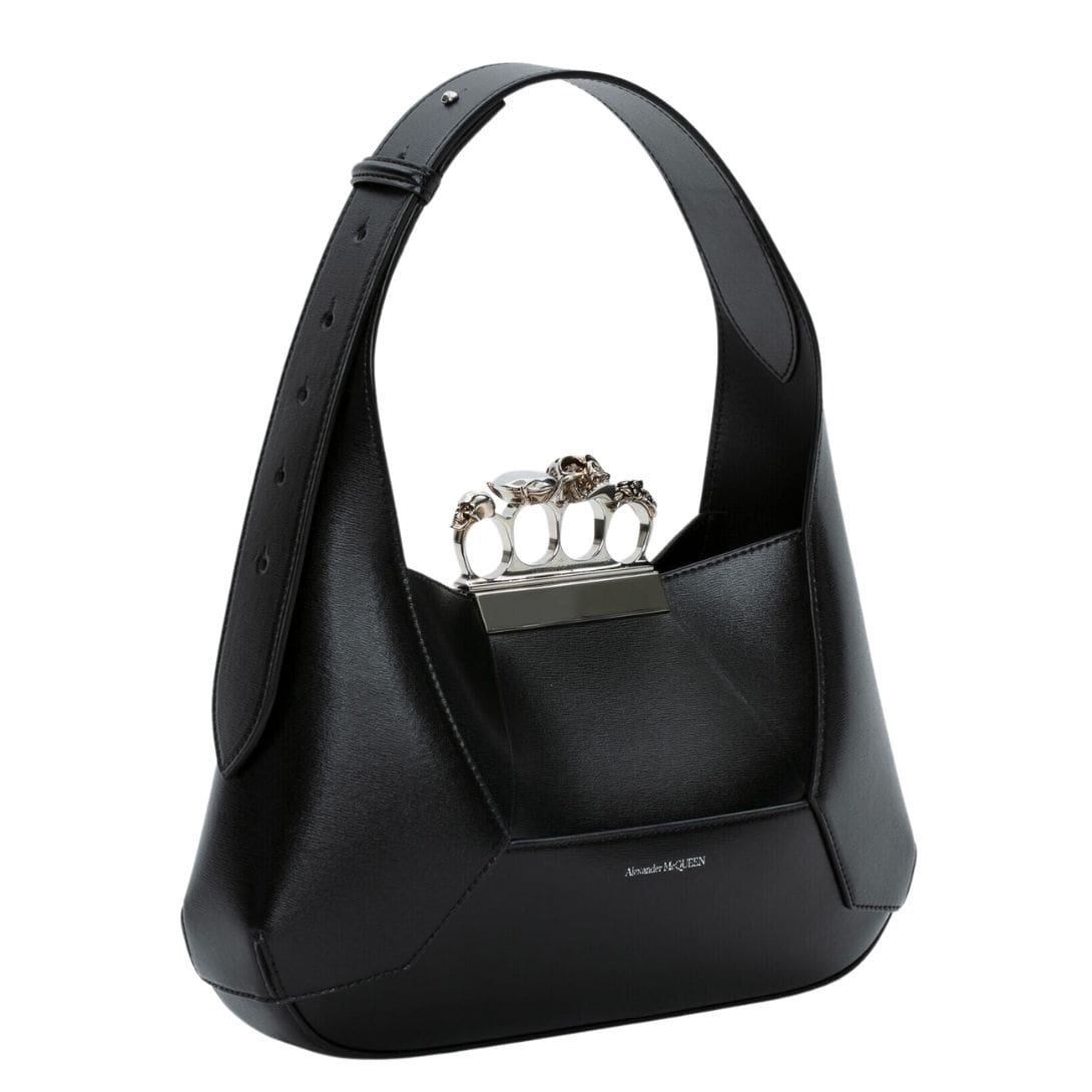 Introducing the Alexander McQueen Women’s the Jewelled Hobo bag in black, crafted from smooth calfskin leather with an antique silver-finished handle adorned with crystal-encrusted rings. Inspired by the faceted stone on the Knuckle, its unique silhouette features leather panels that are intricately cut and re-assembled.