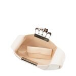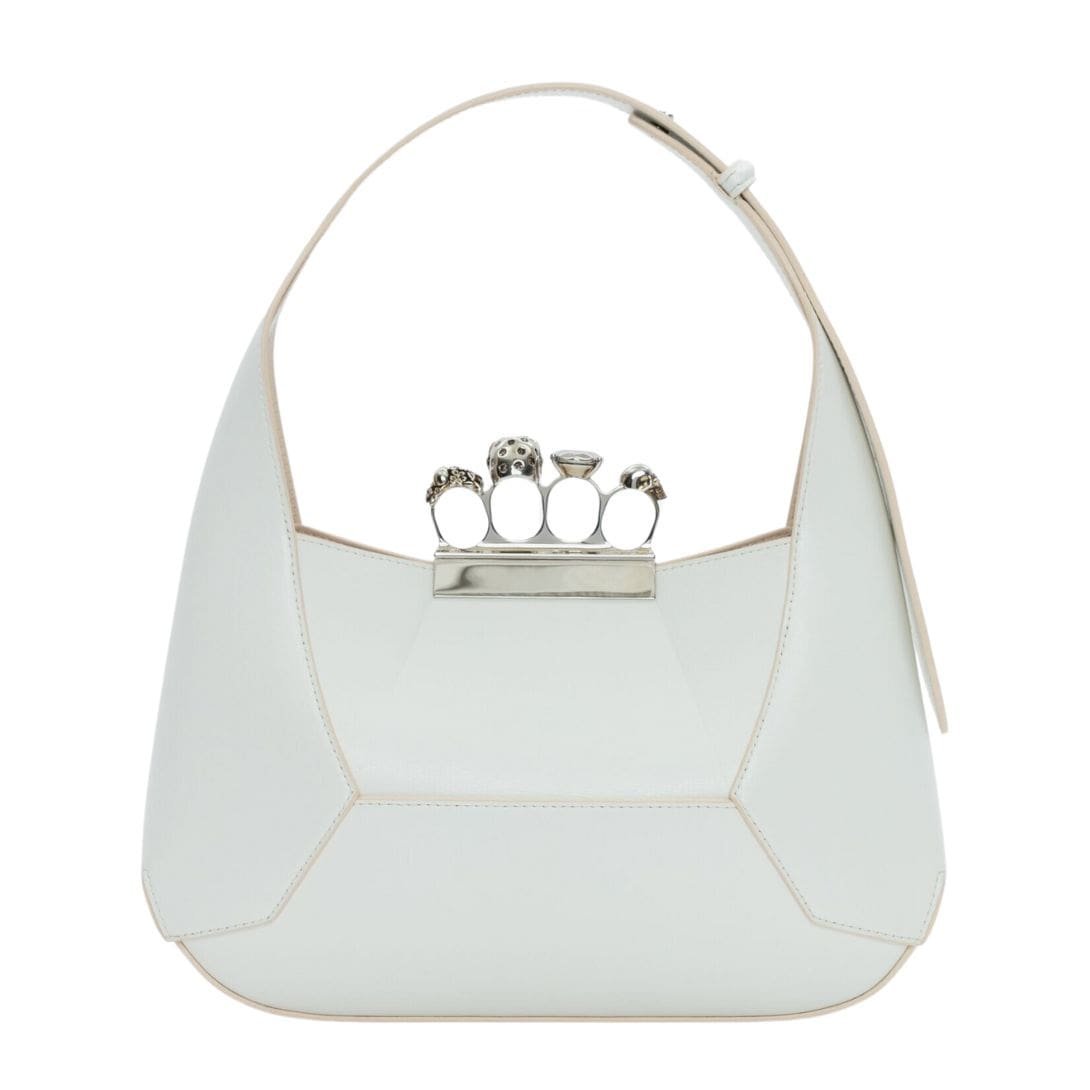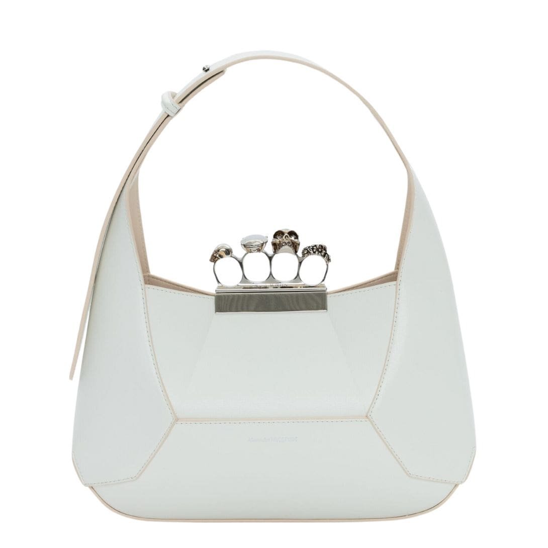 Introducing the Alexander McQueen Women’s the Jewelled Hobo bag in ivory, crafted from smooth calfskin leather with an antique silver-finished handle adorned with crystal-encrusted rings. Inspired by the faceted stone on the Knuckle, its unique silhouette features leather panels that are intricately cut and re-assembled.