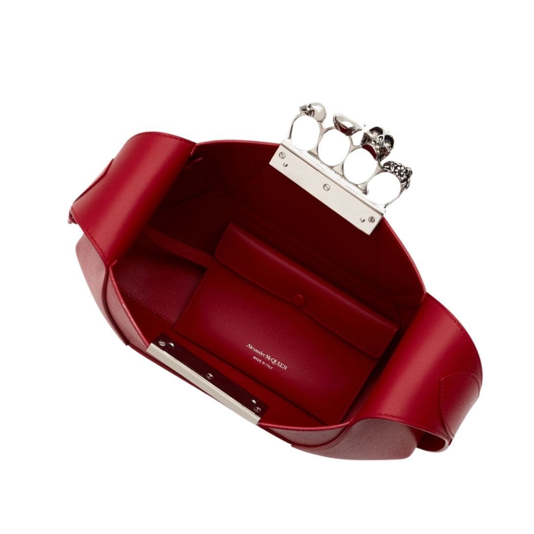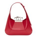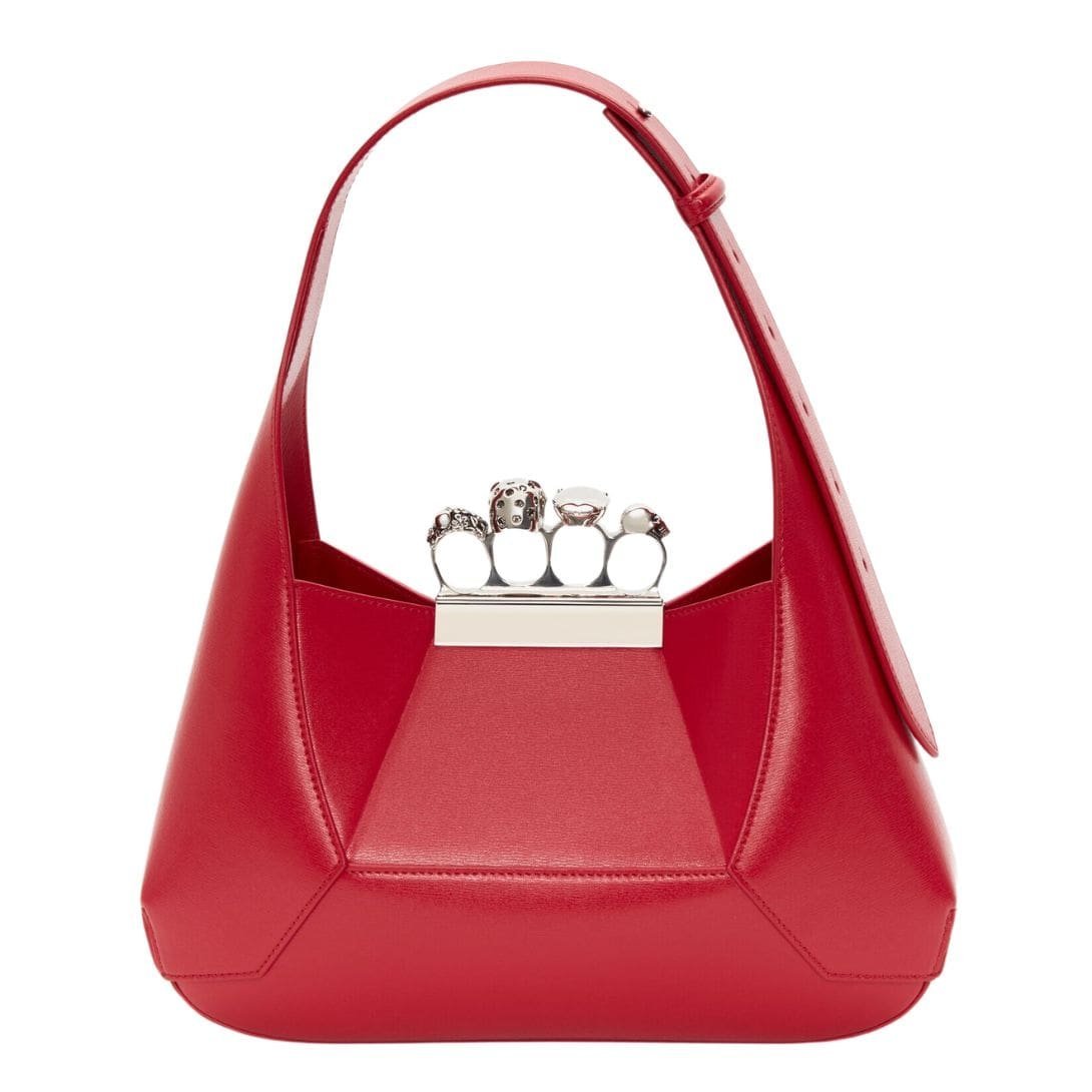 Introducing the Alexander McQueen Women’s the Jewelled Hobo bag in welsh red, crafted from smooth calfskin leather with an antique silver-finished handle adorned with crystal-encrusted rings. Inspired by the faceted stone on the Knuckle, its unique silhouette features leather panels that are intricately cut and re-assembled.