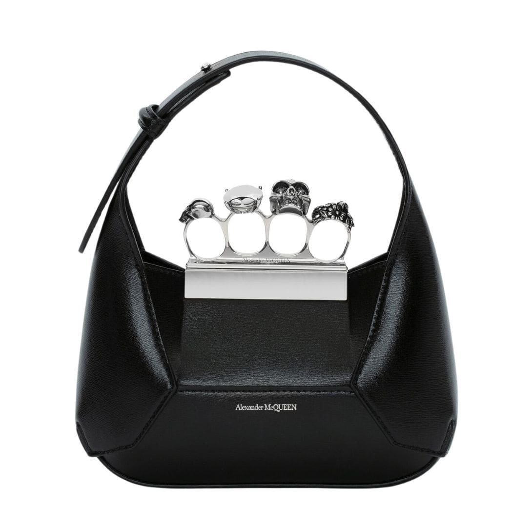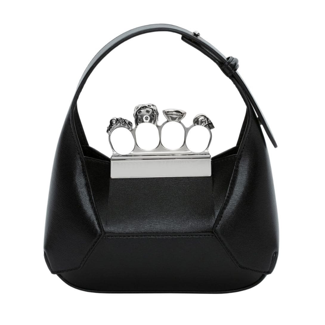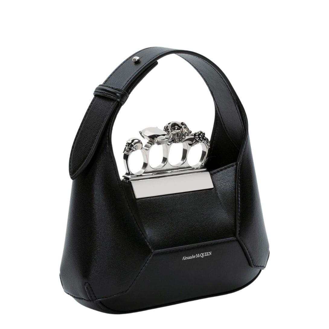 Introducing the Alexander McQueen Womens The Jewelled Hobo Mini Bag In Black, crafted from Camel smooth calfskin leather with an antique silver-finished handle adorned with crystal-encrusted rings. Inspired by the faceted stone on the Knuckle, its unique silhouette features leather panels that are intricately cut and re-assembled.