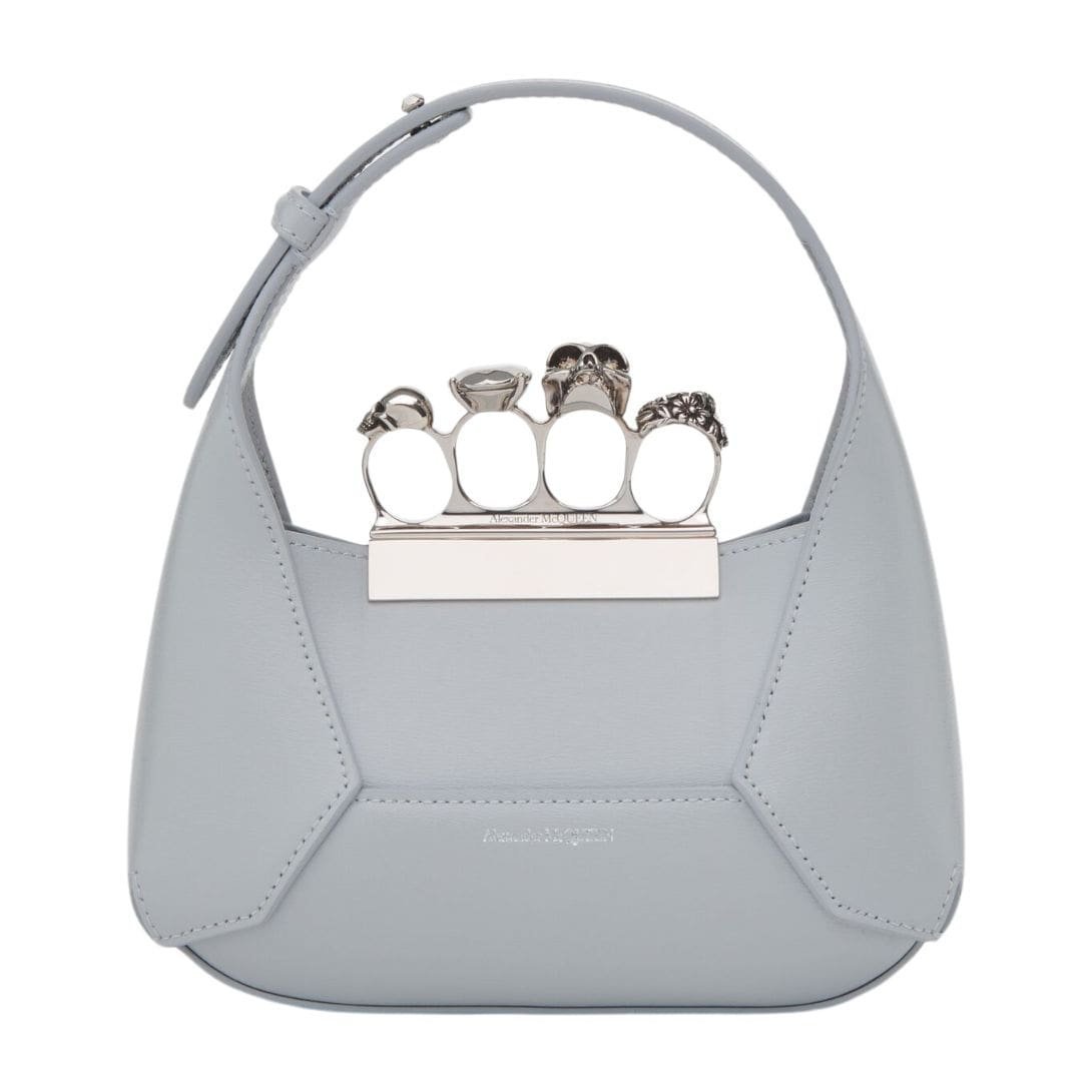 Introducing the Alexander McQueen Womens The Jewelled Hobo Mini Bag In Gray, crafted from Camel smooth calfskin leather with an antique silver-finished handle adorned with crystal-encrusted rings. Inspired by the faceted stone on the Knuckle, its unique silhouette features leather panels that are intricately cut and re-assembled.