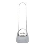 The bag securely fastens with a magnetic closure and features brass hardware with antique silver finishing. Inside, you’ll find a sleek black lining.