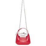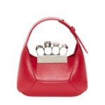 Introducing the Alexander McQueen Women’s the Jewelled Hobo mini bag in welsh red, crafted from smooth welsh red calfskin leather with an antique silver-finished handle adorned with crystal-encrusted rings. Inspired by the faceted stone on the Knuckle, its unique silhouette features leather panels that are intricately cut and re-assembled.