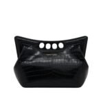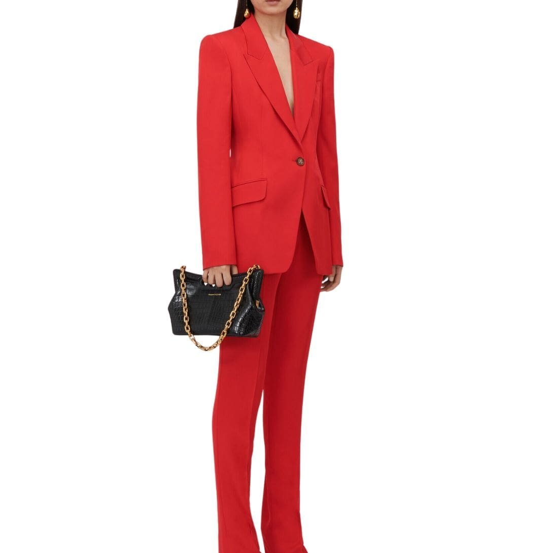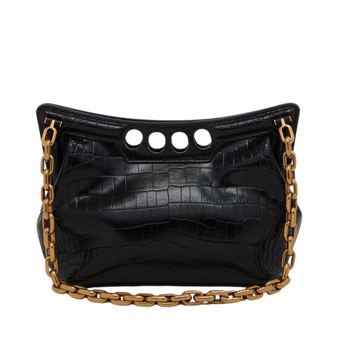 Inspired by the sharp and structured shoulders of tailoring silhouettes, this Alexander McQueen Women’s the Peak bag small in black combines a curve-shaped magnetic frame with a soft body. Handcrafted from a black croc-effect vegan material, it offers quality and durability. Wear it over the shoulder with its antique gold-finished chain strap or hand-held by the four-ring handle.