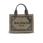 Introducing the B-Army canvas shopping bag, exquisitely crafted with a blend of durable cotton and luxurious calf leather accents. This chic accessory boasts leather handles for added sophistication and features the iconic Balmain logo tastefully printed on its surface. Inside, discover a convenient interior welt pocket, perfect for keeping your essentials organized on the go. Each bag comes meticulously packaged in a protective cover, preserving its pristine condition. Designed and made in Italy, this versatile piece measures 8 x 26 x 32.5 cm, offering ample space for your everyday necessities. Elevate your ensemble with the understated elegance of the B-Army canvas shopping bag.