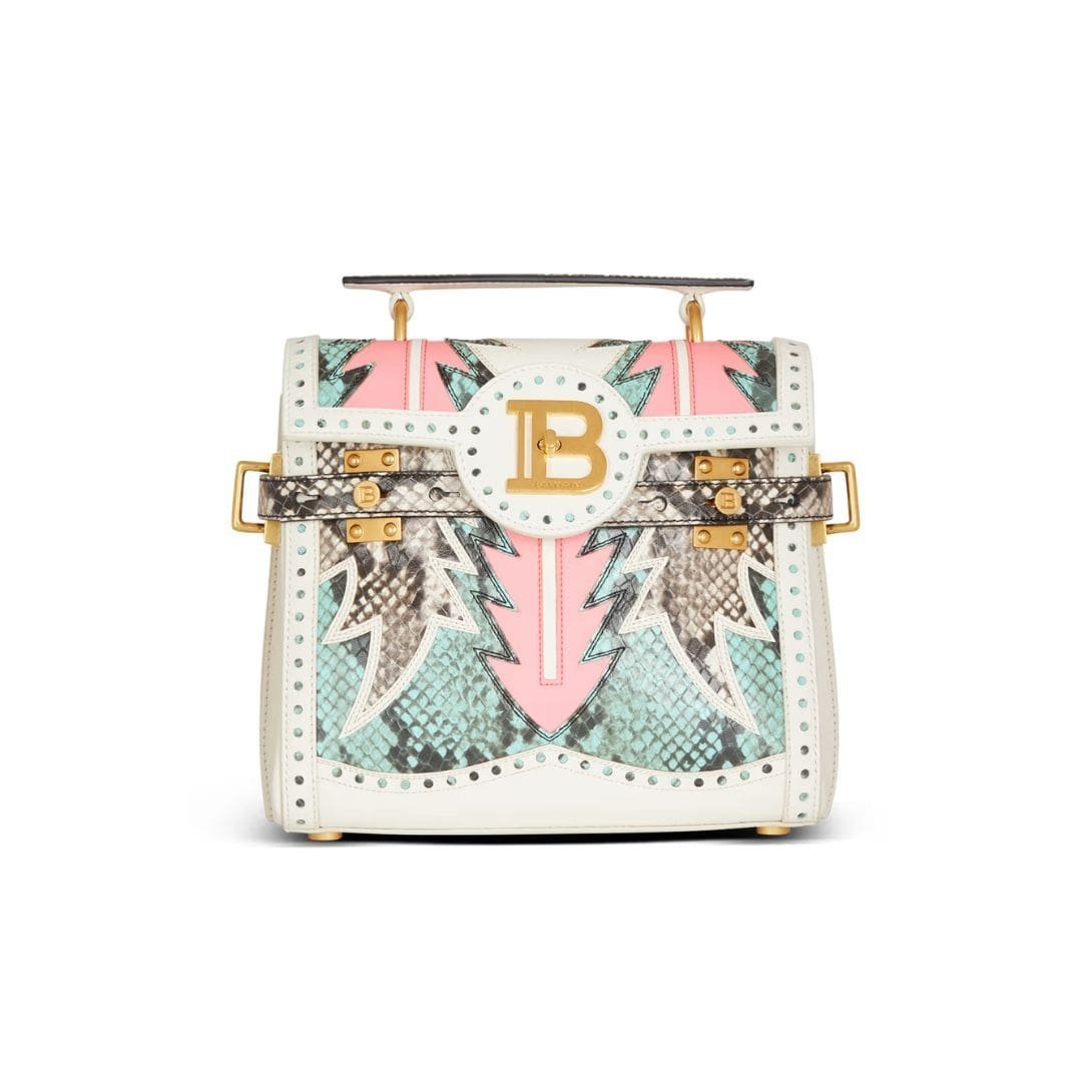 Introducing the Balmain B-Buzz 23 Patchwork Leather Bag, a masterpiece of eclectic design and luxurious craftsmanship.