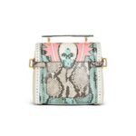 This bag boasts a multi-material composition, featuring snakeskin-effect leather, grained leather, and smooth leather, creating a dynamic and visually captivating aesthetic.