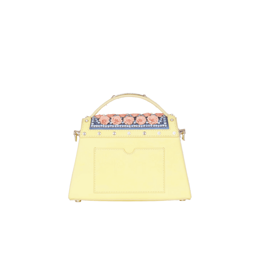 Unlock the epitome of refinement with the quarter-turn B-Twist clasp securing the flap, revealing a meticulously embroidered grid embellished with rhinestones and adorned with captivating 3D roses. Every detail exudes sophistication and charm.