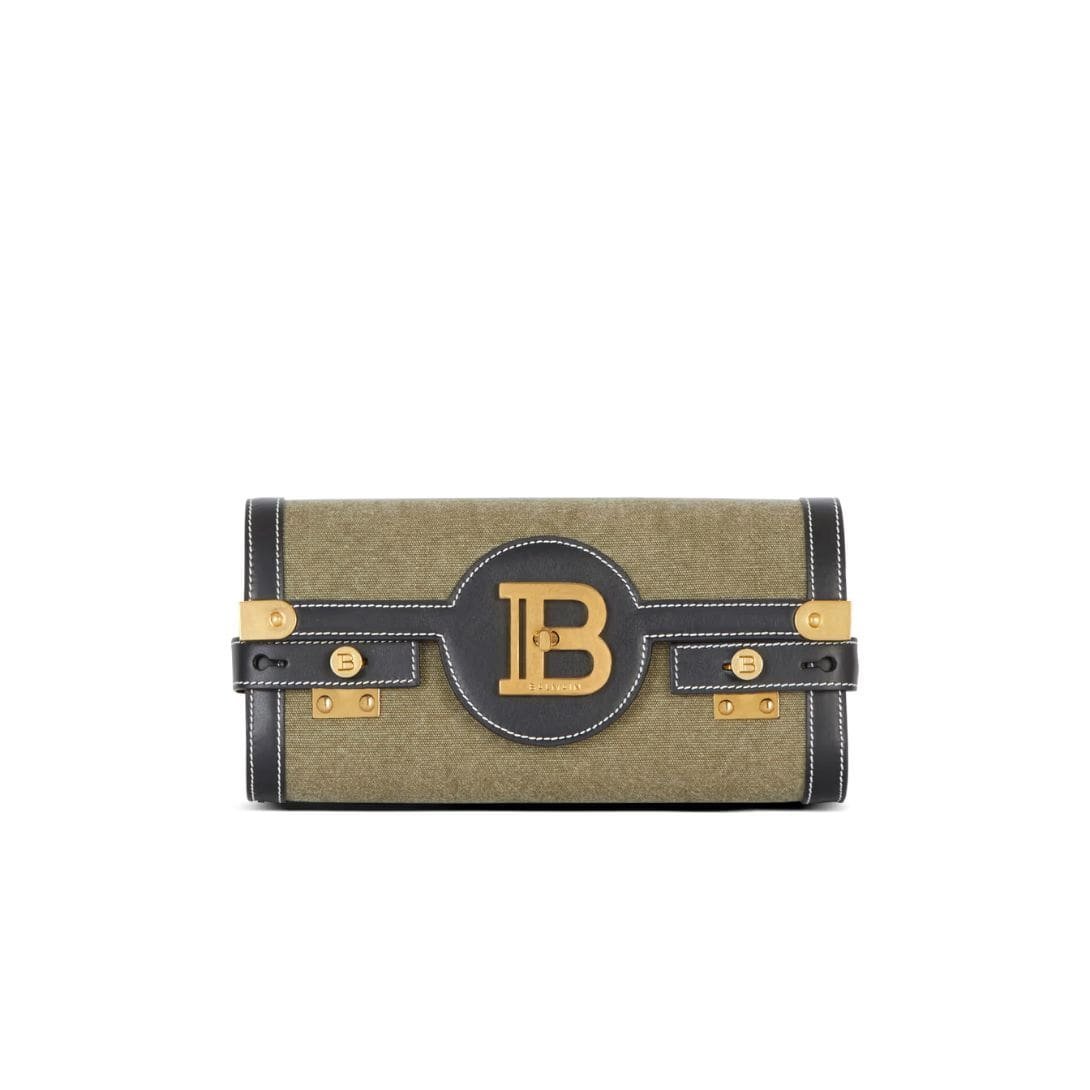 Introducing the Balmain canvas B-Buzz 23 clutch bag with leather panels, a captivating combination of canvas and calfskin that embodies Balmain’s distinctive style and craftsmanship.