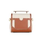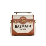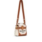 Introducing the Bi-material Balmain Ecru Canvas B-Buzz 23 bag with brown leather panels, a harmonious blend of luxury and functionality designed to make a statement.