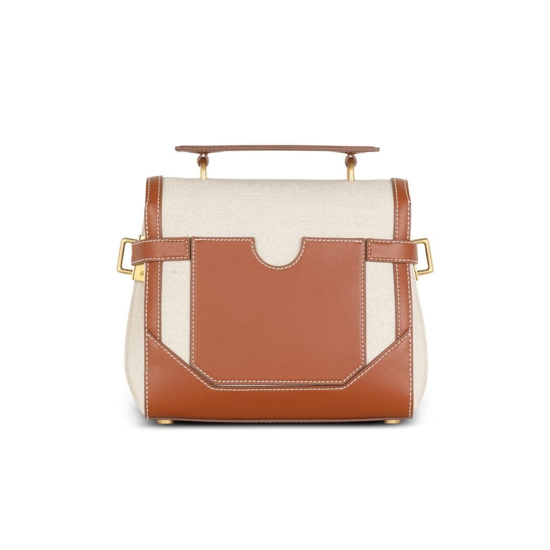BALMAIN ECRU CANVAS B-BUZZ 23 BAG WITH BROWN LEATHER PANELS