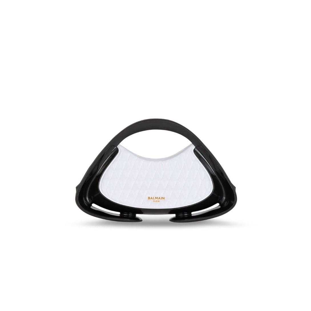 Embellished with the prestigious Balmain Paris metal logo, it exudes sophistication at every turn. Crafted with soft faux leather carry handles that gracefully extend down to the bag’s feet, it ensures comfort and elegance in equal measure. Glossy curved side detailing adds a touch of refinement to its design.