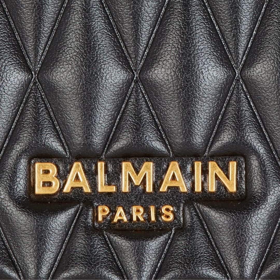 The attention to detail is evident in every aspect of the design, from the precision stitching to the meticulously embossed Balmain logo, which serves as a hallmark of quality and authenticity. The bag features a top handle for easy carrying, as well as a detachable shoulder strap for added versatility, allowing it to be worn crossbody or carried as a chic clutch.