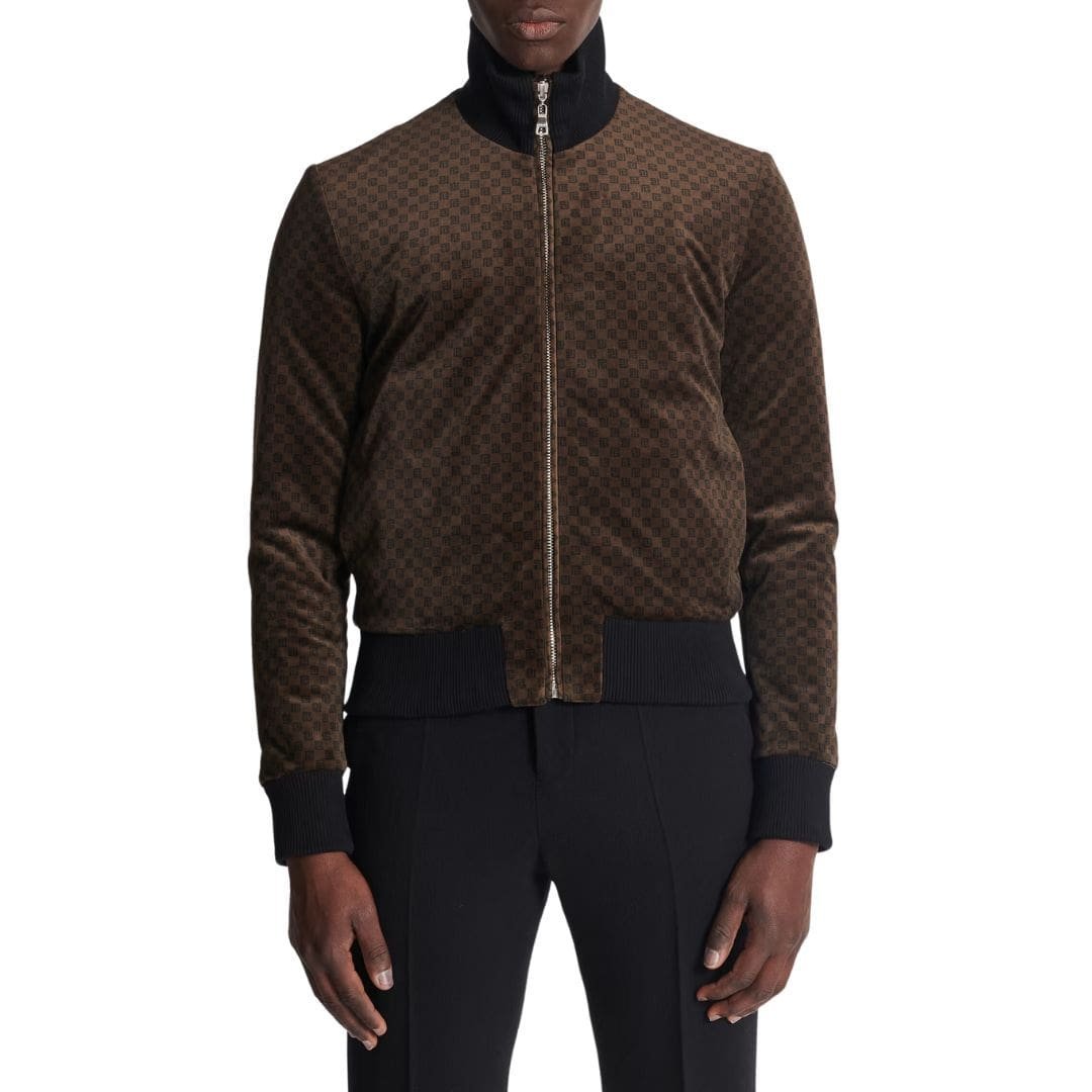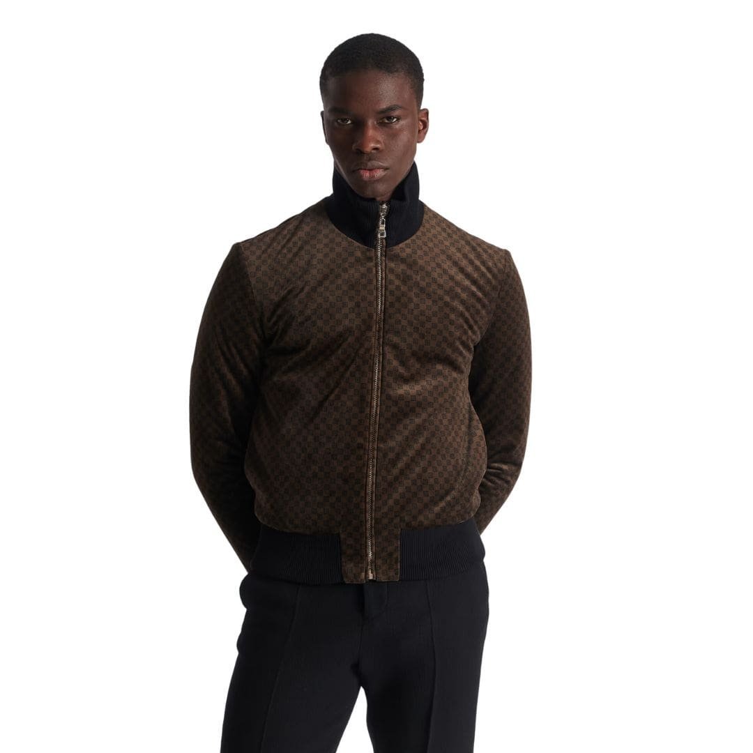 The silhouette of the jacket is tailored to perfection, with a contemporary fit that flatters the physique. The classic bomber style features ribbed cuffs, collar, and hem, adding a touch of sporty elegance to the design. Additionally, practical elements such as zippered pockets offer functionality without compromising on style.