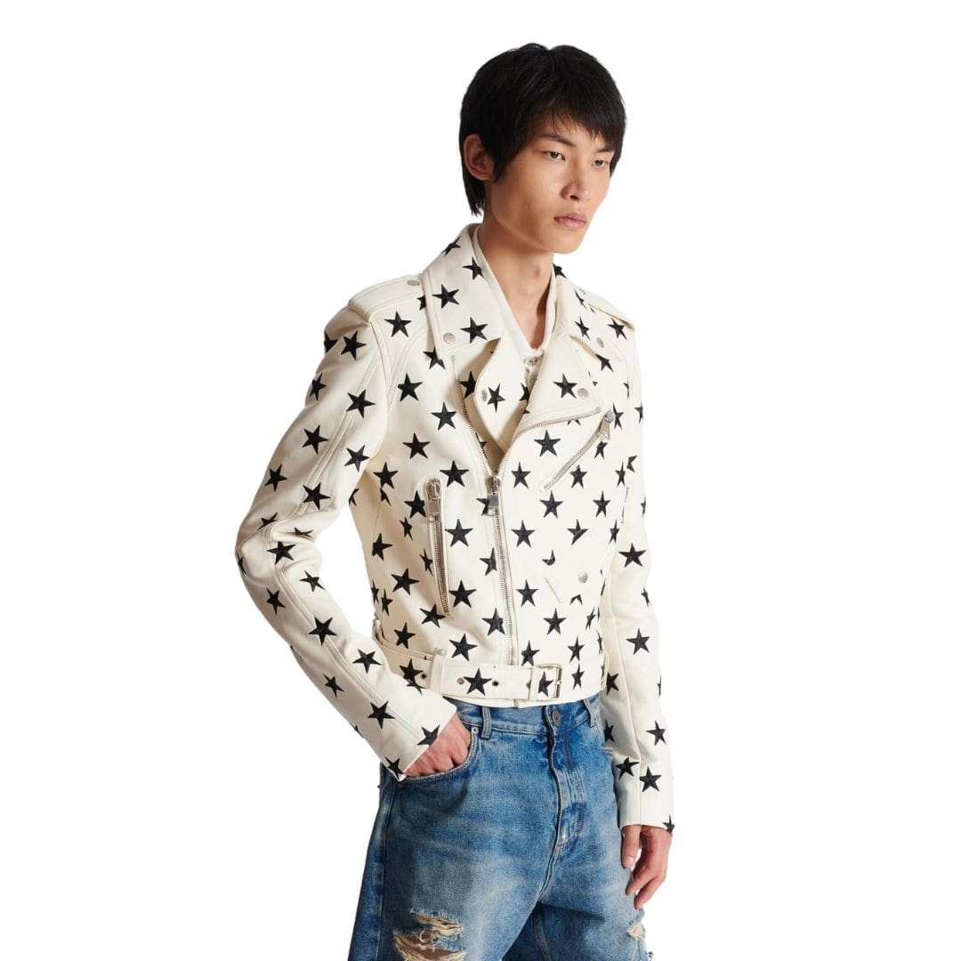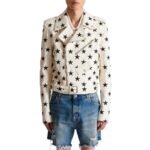 What truly sets this jacket apart is its breathtaking embroidery motif. Intricately woven stars embellish the shoulders, sleeves, and back, adding a celestial allure to the garment. Each star is meticulously crafted with precision and skill, creating a mesmerizing visual impact that captivates the imagination. The juxtaposition of the celestial motif against the rugged leather creates a striking contrast, infusing the jacket with a sense of celestial mystique.