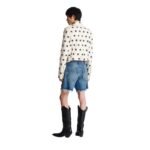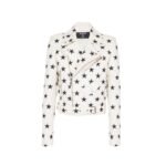 The biker jacket silhouette exudes an unmistakable aura of rebellion and sophistication, epitomizing the brand’s rock ‘n’ roll aesthetic. Featuring a sleek asymmetrical zip closure and signature silver-toned hardware, it exudes a sense of rugged elegance that is both contemporary and timeless. The structured shoulders and tailored fit enhance the wearer’s silhouette, exuding confidence and power.