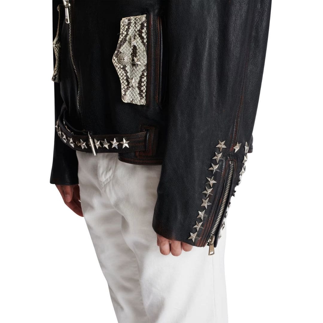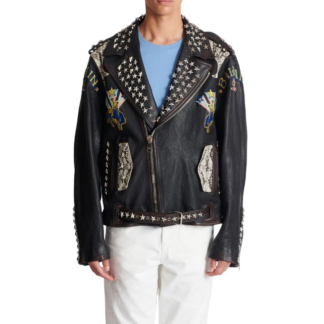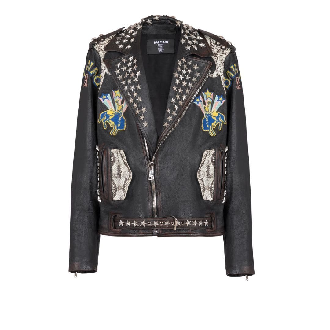 The standout feature of the Balmain Western Leather Biker Jacket is its distinctive Western-inspired design elements. Intricate stitching details adorn the shoulders, sleeves, and back, drawing inspiration from traditional cowboy attire. These intricate embellishments add a touch of artisanal craftsmanship to the jacket, elevating its aesthetic appeal.