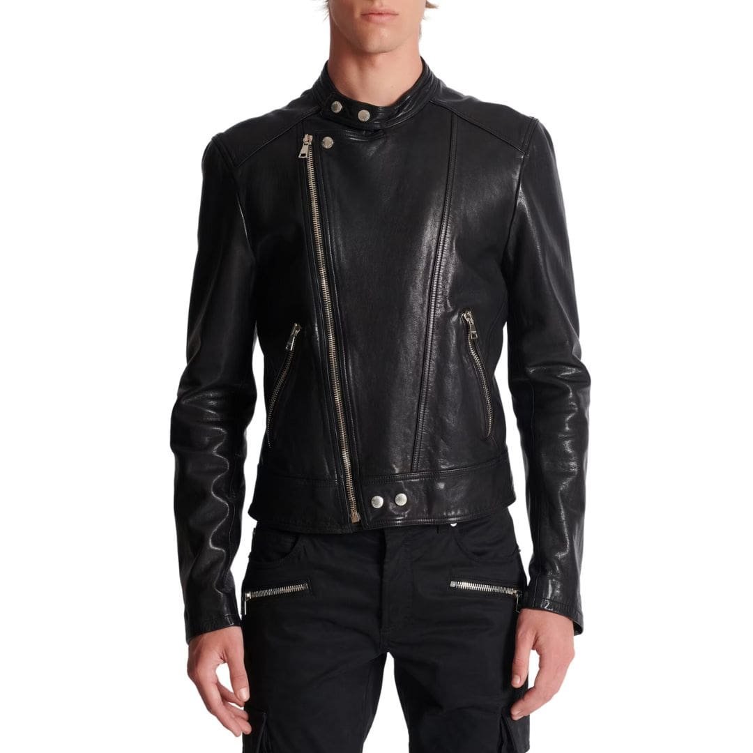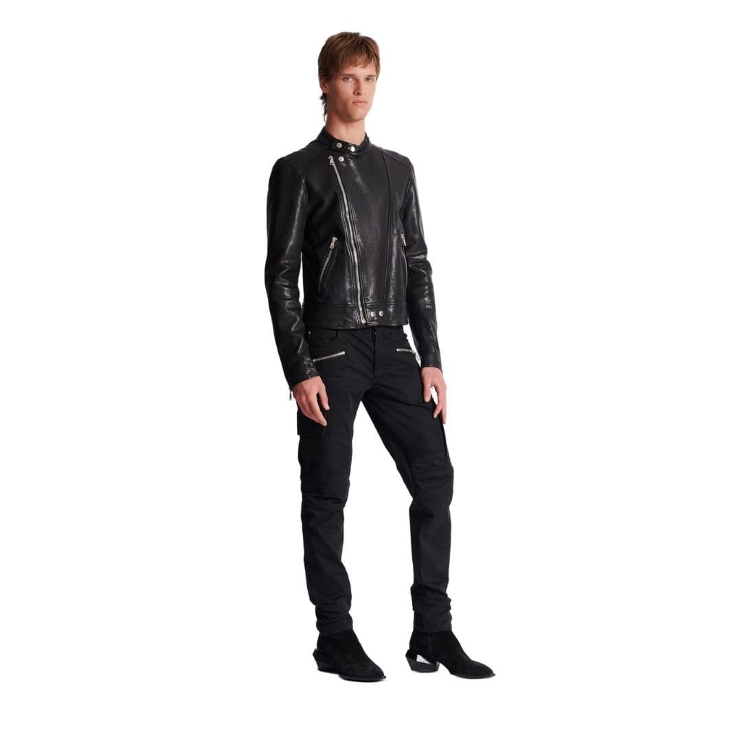 The Balmain Zipped Leather Biker Jacket epitomizes the essence of timeless rebellion and luxurious craftsmanship. Crafted with precision from supple lambskin leather, it’s not just a garment; it’s an emblem of daring sophistication. This iconic piece seamlessly marries the rugged allure of a classic biker silhouette with the refined elegance characteristic of the Balmain brand.