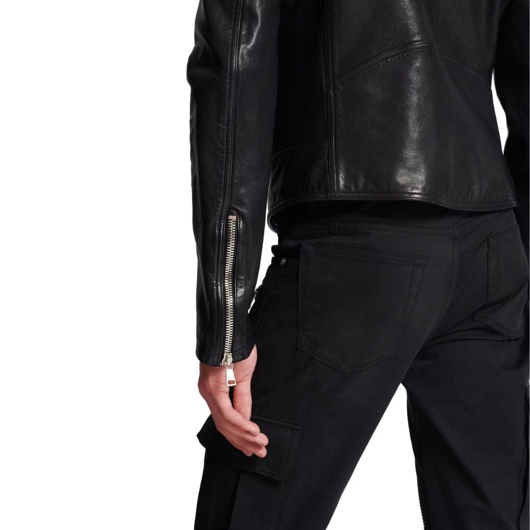 At first glance, the jacket’s sleek lines and tailored fit exude an air of effortless cool. Its asymmetrical front zipper closure, adorned with polished hardware, adds a dash of edgy charm while ensuring a snug, flattering fit. The robust yet buttery soft leather drapes over the body, promising both durability and comfort, while the quilted panels on the shoulders and sleeves lend a nod to traditional moto styling.