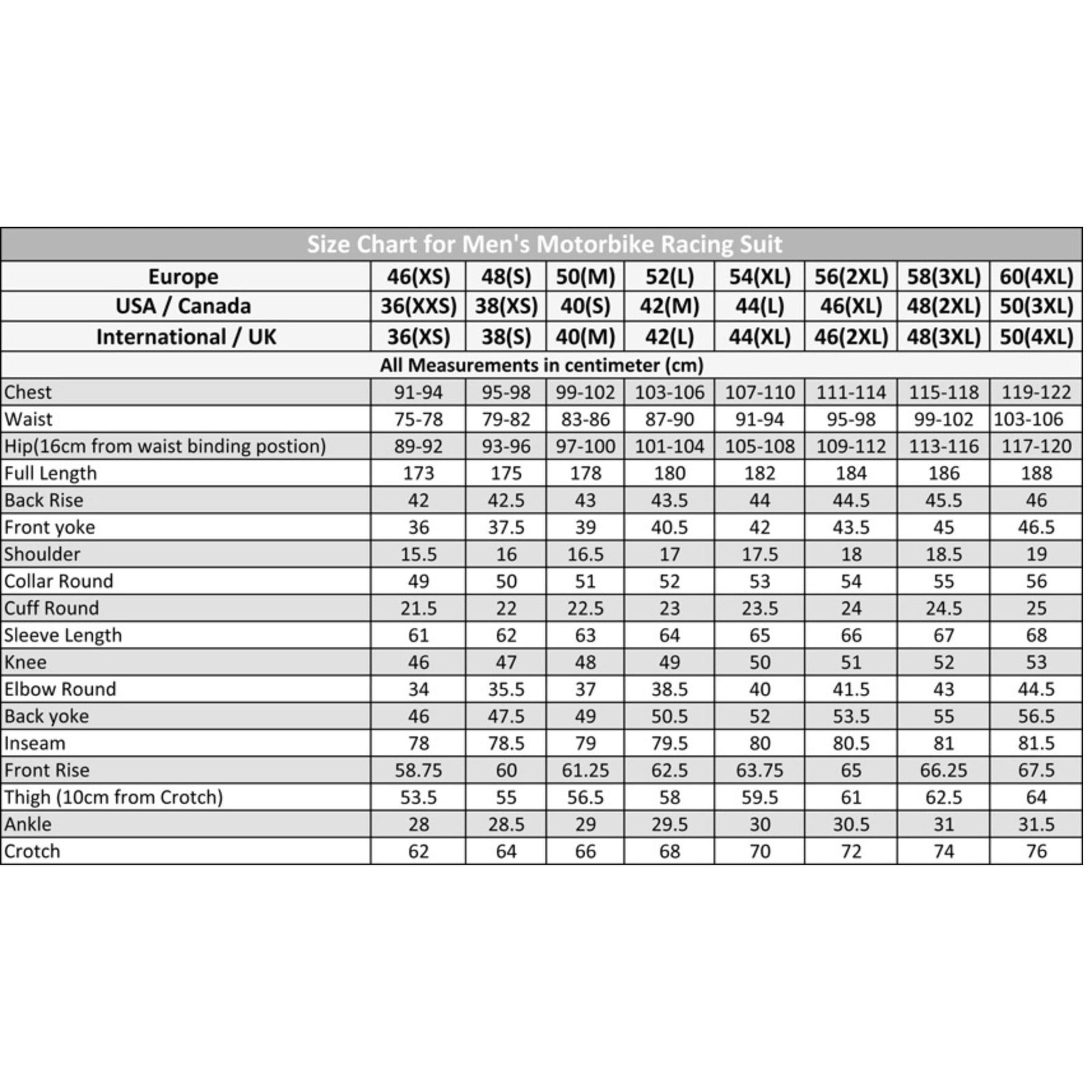 EU: 60(4XL) — US: 50(3XL) — UK: 50(4XL)