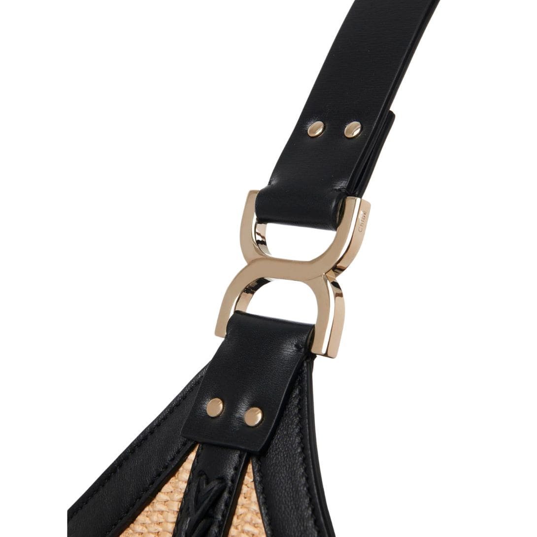 Crafted with meticulous attention to detail, the Marcie hobo bag is a tactile masterpiece, weaving together a textural interplay of raffia and supple calfskin. Its artisanal charm is accentuated by the presence of the line’s signature metallic piece adorning the leather handle, a nod to its heritage and craftsmanship.