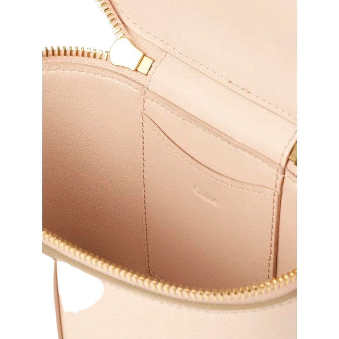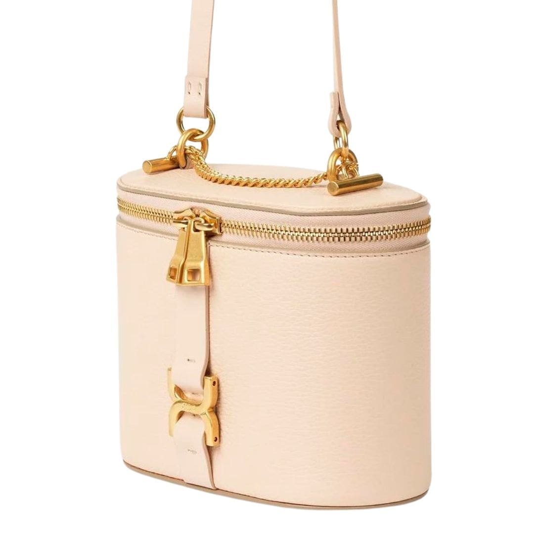 Chloé introduces the Chloe Marcie Mini Vanity on Chain Cement Pink. as a charming addition to its iconic Marcie line, offering a blend of elegance and practicality. Crafted from luxurious grained calfskin leather and adorned with gold-toned hardware, this miniature vanity exudes sophistication.