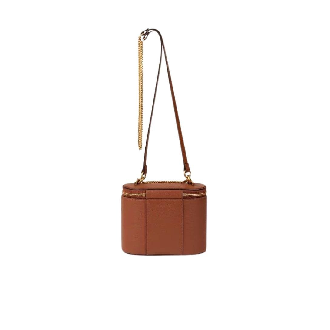 Chloé introduces the Chloe Marcie Mini Vanity on Chain Tan. as a charming addition to its iconic Marcie line, offering a blend of elegance and practicality. Crafted from luxurious grained calfskin leather and adorned with gold-toned hardware, this miniature vanity exudes sophistication.