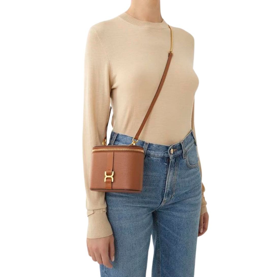 In conclusion, the Chloé Marcie Mini Vanity on Chain in tan embodies Maison’s enduring legacy of luxury and style. From its exquisite craftsmanship to its timeless design elements, it serves as a testament to the brand’s commitment to sophistication and refinement.