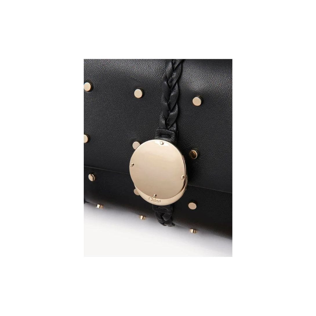 Chloe Penelope Mini Soft Shoulder Bag black. is a masterclass in blending sophistication with a hint of rebellion. Crafted from smooth calfskin adorned with all-over studs, it exudes a rock ‘n’ roll attitude while maintaining an air of timeless elegance. This compact version of the larger Penelope bag retains the slouchy silhouette and feminine lines, making it a versatile accessory for day-to-evening wear.