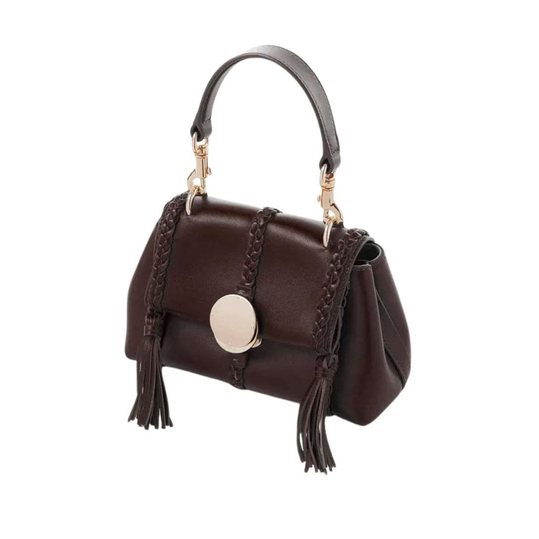 Crafted with meticulous attention to detail, the Chloe Penelope Mini Soft Shoulder Bag Deep Violine. exudes sophistication and elegance. Constructed from naturally grained bull leather, known for its smooth texture, this bag boasts a rounded flap silhouette that embodies a relaxed yet feminine allure. The design is a testament to Chloe’s commitment to impeccable craftsmanship and timeless style, featuring refined details such as leather braiding, dangling tassels, and contrasting hardware.