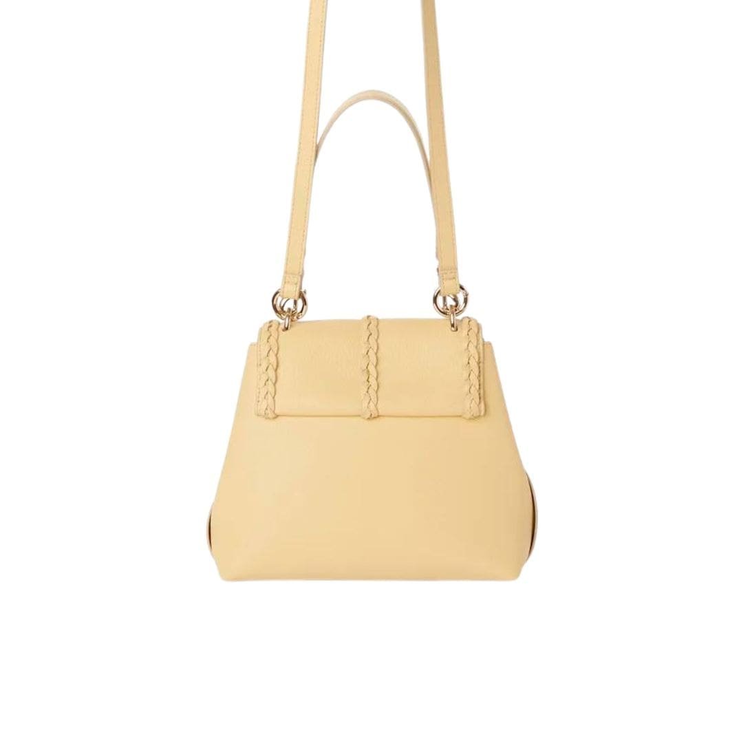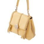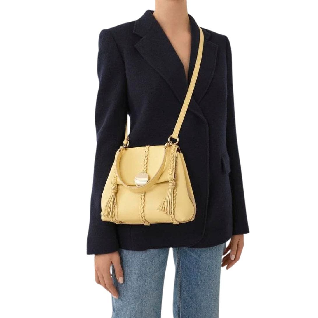 Crafted with meticulous attention to detail, the Chloe Penelope Small Soft Shoulder Bag Softy Yellow. exudes sophistication and elegance. Constructed from naturally grained bull leather, known for its smooth texture, this bag boasts a rounded flap silhouette that embodies a relaxed yet feminine allure. The design is a testament to Chloe’s commitment to impeccable craftsmanship and timeless style, featuring refined details such as leather braiding, dangling tassels, and contrasting hardware.