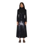 The Dodo Bar Or Amaliya Dress is crafted from a square mirror-embellished jersey, featuring a high-neck silhouette with long flared sleeves.