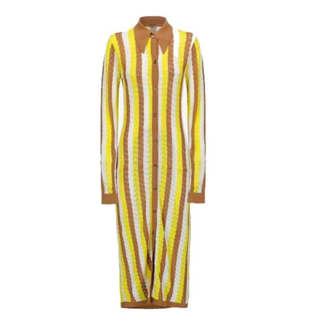 The Dodo Bar OR Dar Dress is crafted from a multicolored striped pointelle knit, designed for a relaxed fit. It features a point collar and button fastening through the front.