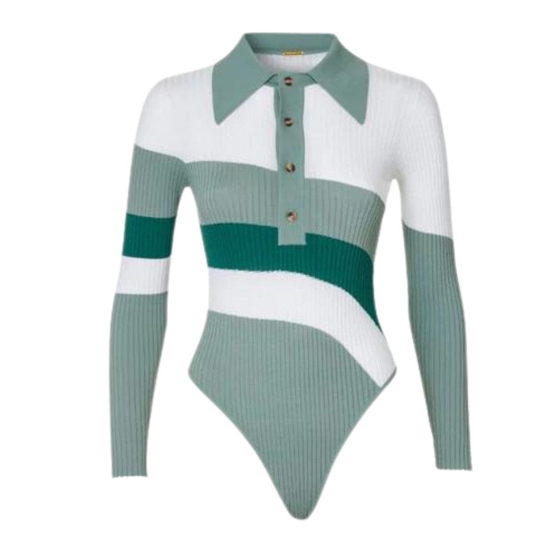 The Dodo Bar Or Hera Bodysuit is crafted from ribbed knit, ensuring a snug fit with a point collar and front button accents.