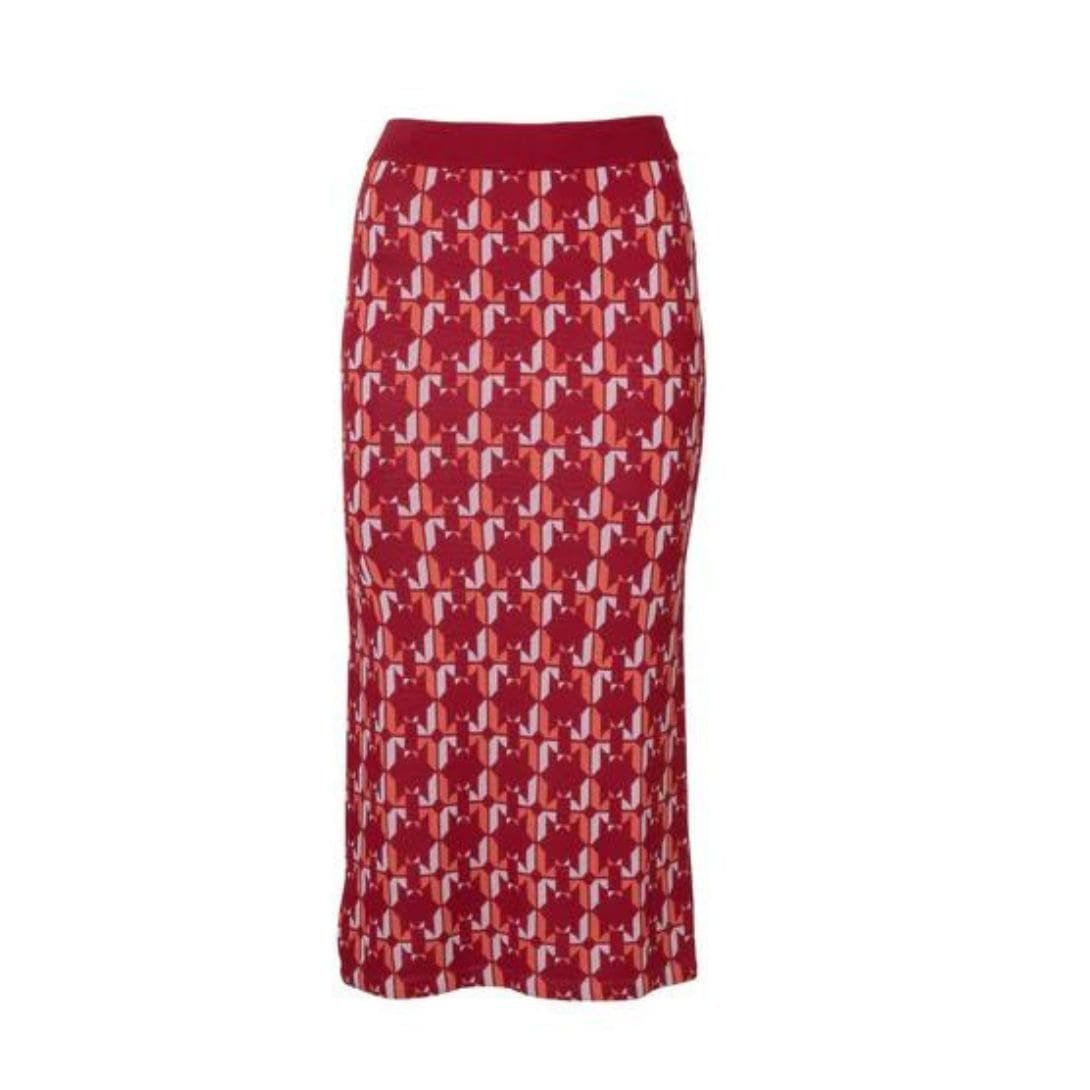 The dodo bar or Kari Skirt’ is expertly crafted from geometric jacquard knit and features an elasticated ribbed waistband, a side slit, and a high-waisted fit.