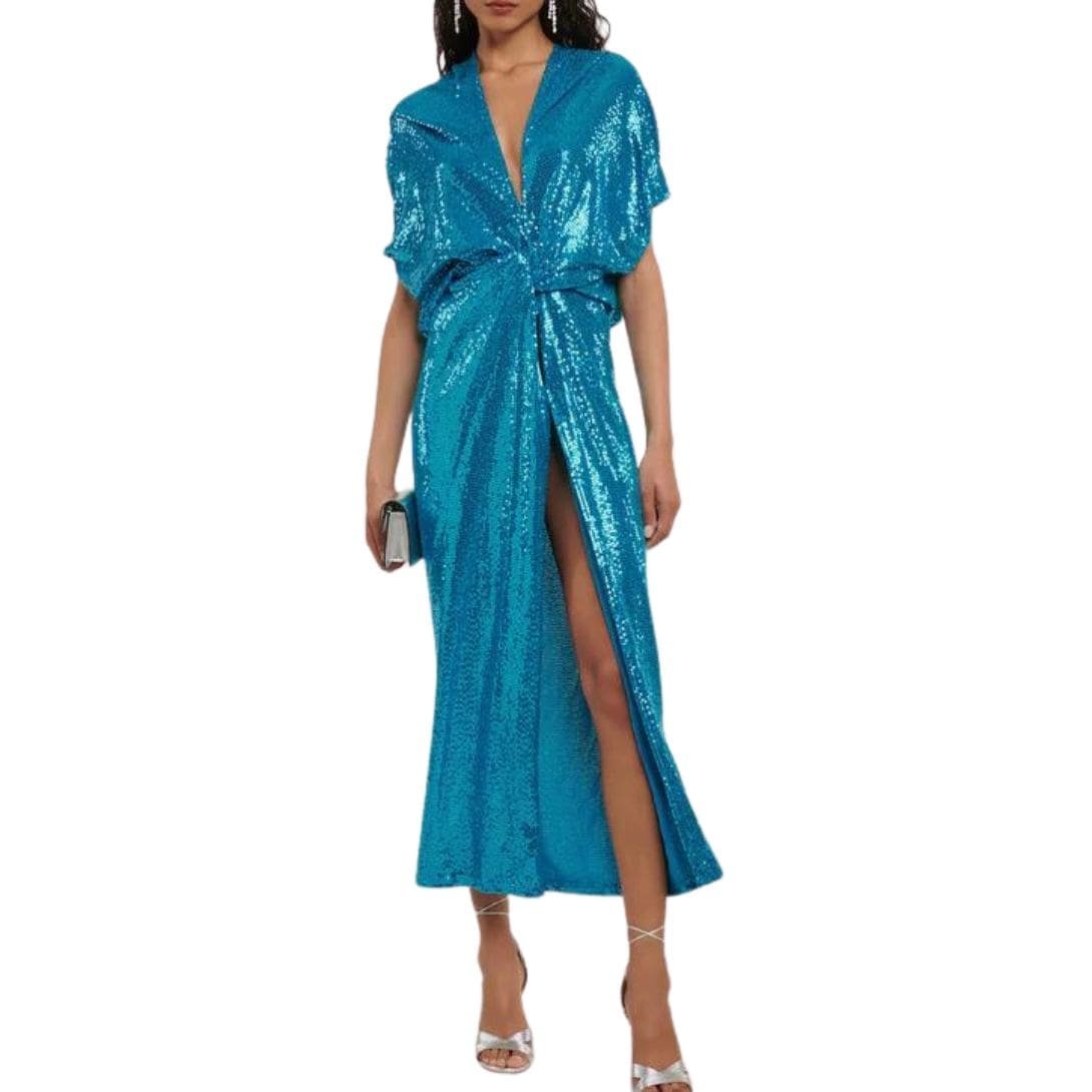 The Dodo Bar Or Kimel Dress is crafted from lightweight jersey saturated with sequins, designed for a relaxed fit. It features a deep open neckline with gathered details.