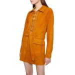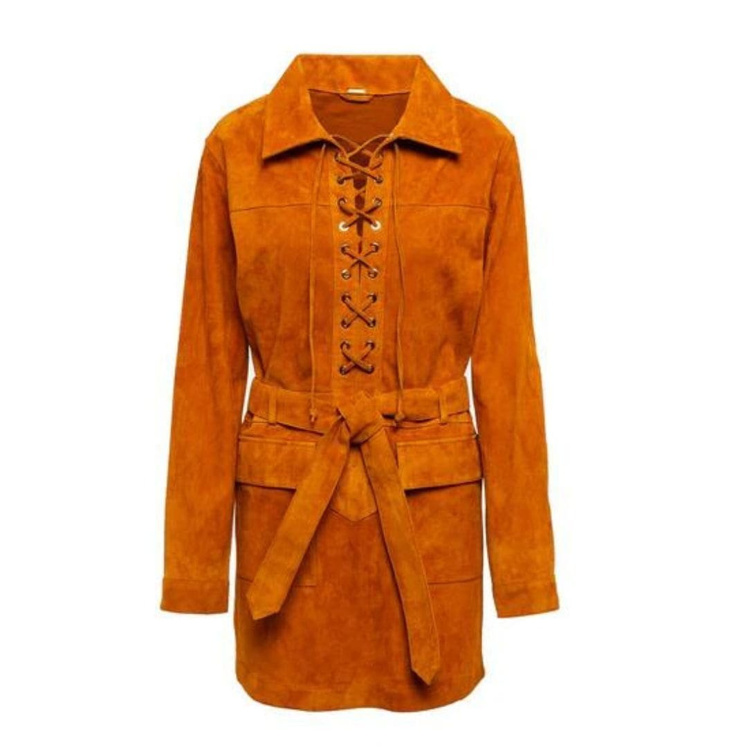 The Dodo Bar OR Marina Mini Dress’ is crafted from black suede, featuring a long-sleeved silhouette with an elasticated lace closure in the front. It includes a tonal belt that cinches the waist and ties at the front, along with flap pockets.