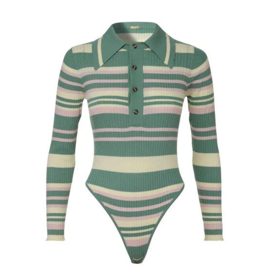 The doDO BAR OR Penny Bodysuit is designed for a tight fit and features knitted stripes, an accentuated collar, and a buttoning top.