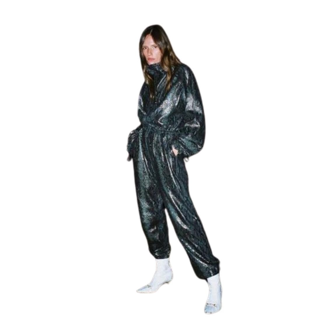 Dodo Bar or Piki B Jumpsuit is crafted from 100% leather, featuring an oversized fit with an exaggerated drawstring collar, drawstring details at the wrists, and cuffed ankles.