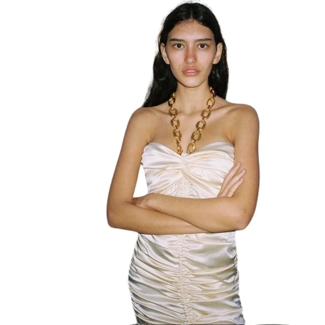 The Dodo Bar Or Roxy Dress is characterized by densely ruched seams creating gentle folds. It features a sweetheart neckline and a halter neck gold chain.