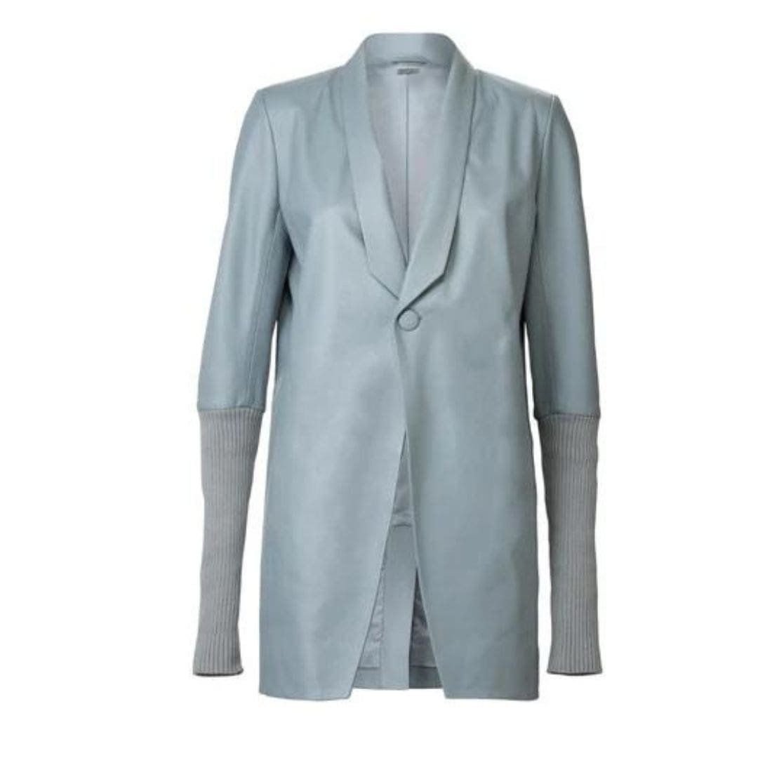 The Dodo Bar OR Todd Jacket is crafted from 100% leather, featuring a single-breasted blazer design with shawl lapels. It includes long sleeves with extended ribbed knit cuffs, a single button fastening, a rear vent, and a longline hem.