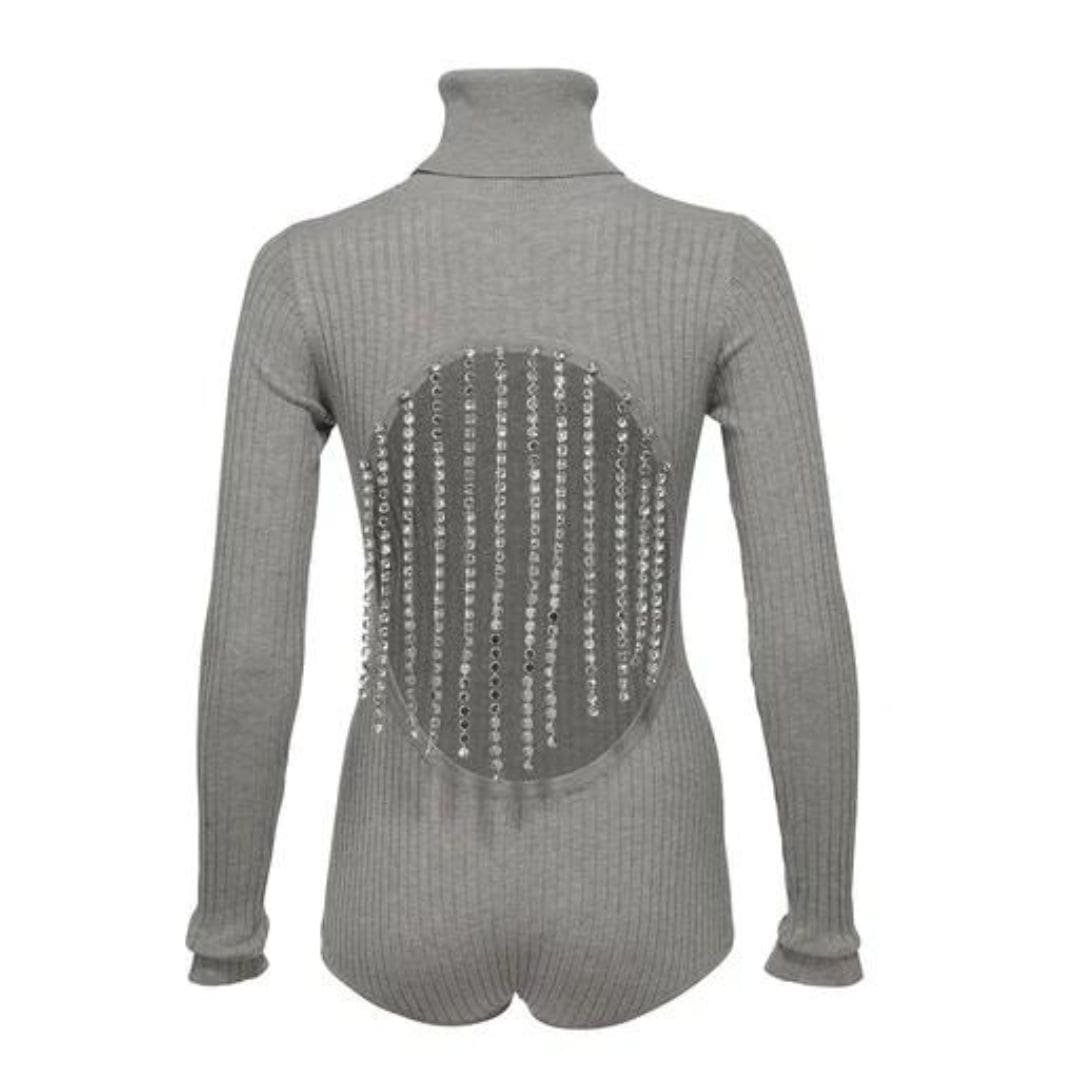 The DODO bar or Ziggy Bodysuit is crafted from ribbed knit and features long sleeves, a high neck, and a circle cut-out back embellished with crystal chains.