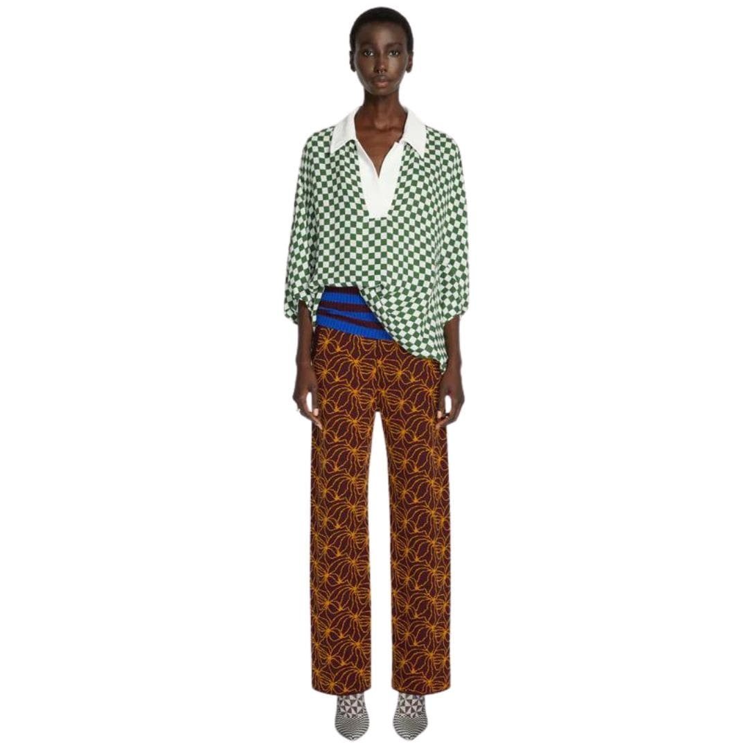 Crafted from lightweight checked viscose, the polo top offers a loose fit that drapes effortlessly on the body, providing comfort and a modern silhouette. The viscose fabric not only lends a smooth and silky texture but also enhances the top’s breathability, making it ideal for warmer weather or layering under jackets and cardigans.