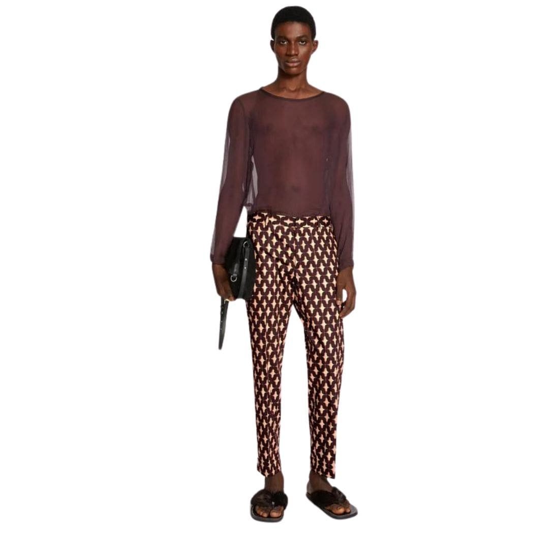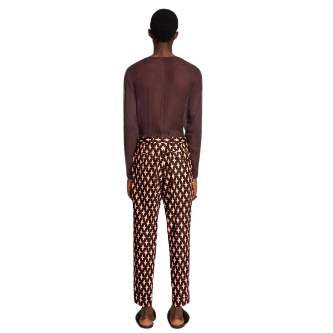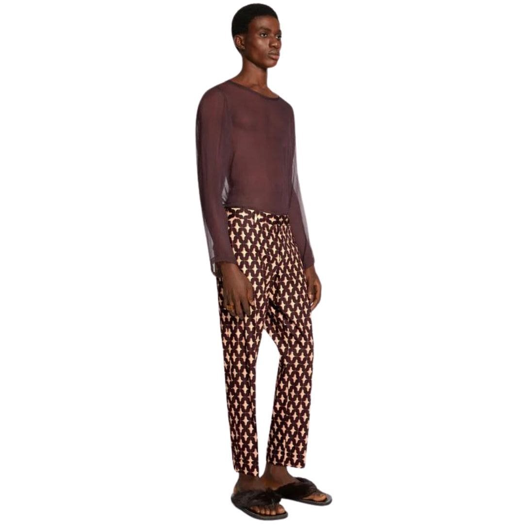 These Dries Van Noten cuffed pants embody contemporary sophistication with a refined edge. Meticulously crafted, they feature a flattering mid-rise waist and a tailored silhouette that effortlessly transitions from day to night. The cuffed hem adds a touch of modernity, while the inclusion of practical side slit pockets and back welt pockets offers both style and functionality. Finished with subtle detailing and a front closure, these pants are versatile wardrobe essentials that exude understated elegance in any setting.
