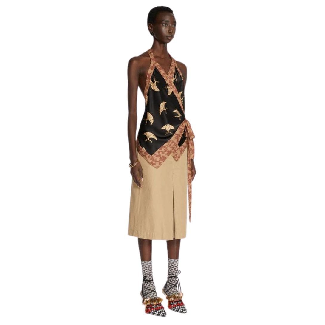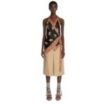 The top’s design is a testament to Dries Van Noten’s mastery of draping and fabric manipulation. The silk satin material drapes effortlessly, creating a fluid and elegant silhouette that enhances the wearer’s figure with a sense of graceful movement. The halterneck style adds a touch of allure, framing the shoulders and collarbones while providing a secure and comfortable fit.