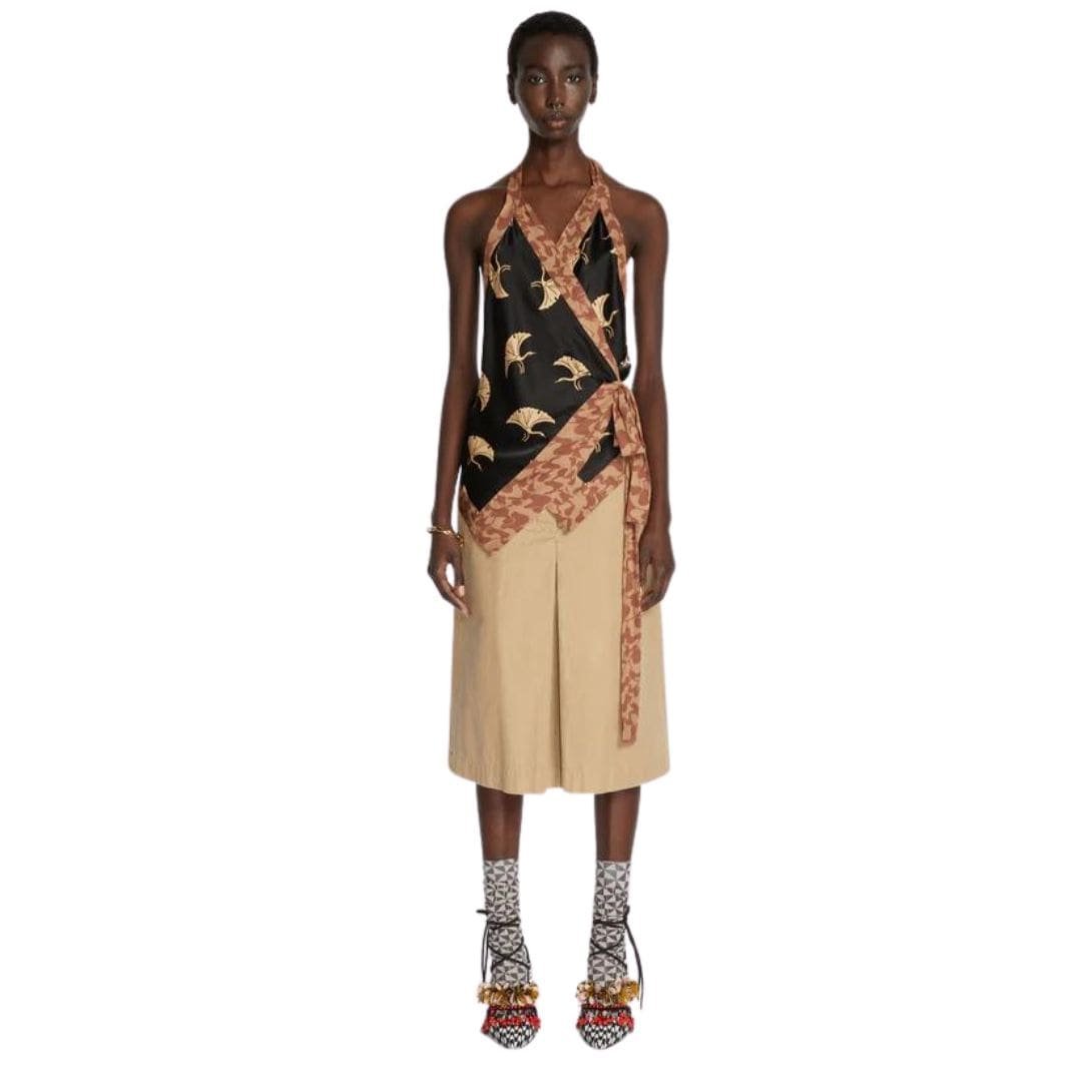 Printed with intricate patterns or motifs, the silk satin fabric further elevates the top’s aesthetic appeal. The print, meticulously designed and executed, adds visual interest and depth to the garment, showcasing Dries Van Noten’s penchant for blending bold designs with delicate fabrics. Whether it features abstract art-inspired prints, botanical motifs, or geometric patterns, each iteration of the printed silk satin wrap top tells a unique visual story, making it a standout piece in any wardrobe.