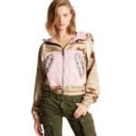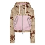 At first glance, the jacket’s standout feature is its eye-catching camouflage pattern, reimagined with a contemporary twist. The camo print is infused with a subtle yet dazzling array of diamond-shaped embellishments, adding a touch of opulence and sophistication to the otherwise rugged motif. This juxtaposition of ruggedness and refinement creates a unique visual appeal that sets the garment apart from conventional outerwear.