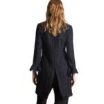 The design features a double-breasted front, a nod to classic tailoring, with a contemporary twist. Large, statement buttons made from high-quality metal or horn add a touch of elegance and practicality, ensuring the coat remains securely fastened. The notched lapels and sharp lines contribute to the coat’s polished appearance, making it suitable for both formal and casual settings.